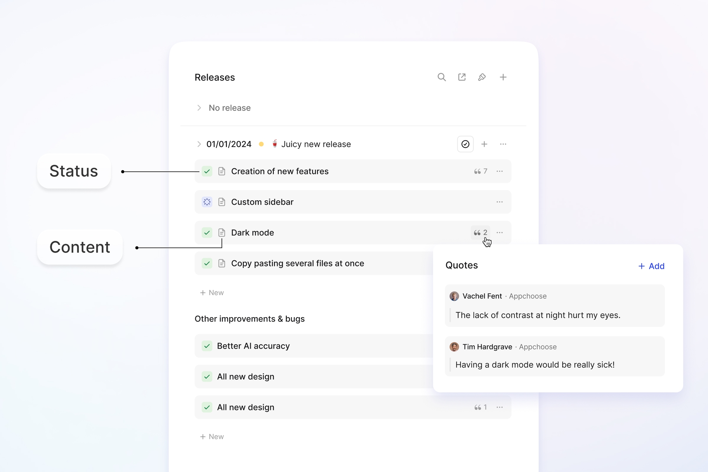 We improved the design for release notes: feature statuses and customer quotes are now visible, giving you full context for your product marketing. Write release notes with empathy, they say?