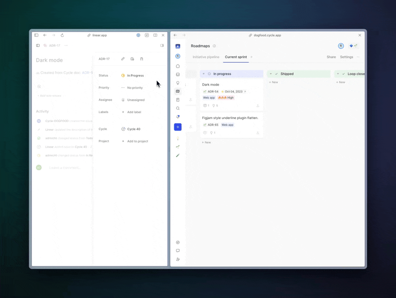 The big picture is that you can map any Cycle feature/bug with a Linear project/issue, mirroring its status in real time. No more double-status entries! The same for GitHub and Jira will follow soon.